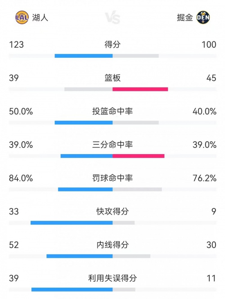在利用對方失誤得分上,湖人也是39-11遙遙領(lǐng)先掘金。