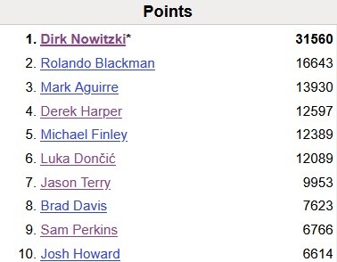 本場過后,諾維茨基隊史得分來到16644分,超越羅蘭多-布萊克曼(16643分),成為球隊的得分王。而諾維茨基在小牛的最終職業(yè)生涯得分定格在31560分。