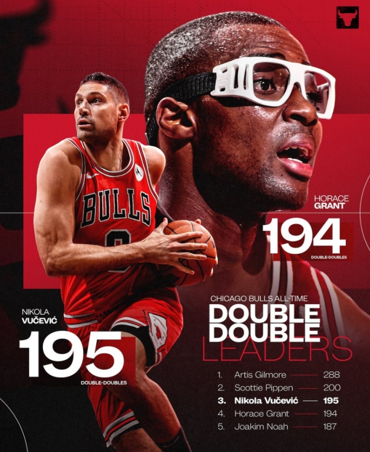 武切維奇公牛兩雙數(shù)超越”眼鏡蛇“格蘭特 上升至隊(duì)史第三位