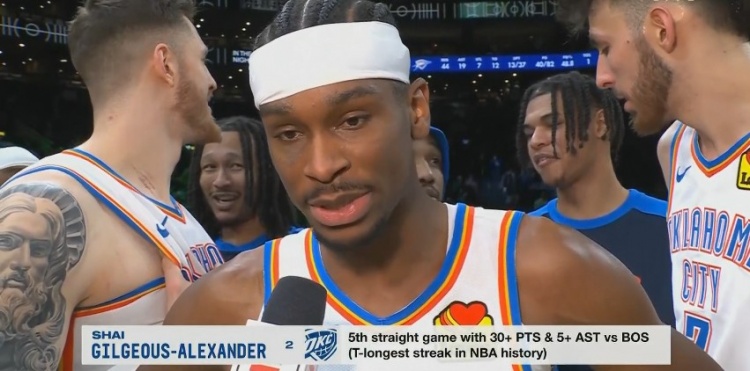 據(jù)統(tǒng)計(jì),亞歷山大對(duì)陣凱爾特人已經(jīng)連續(xù)5場(chǎng)拿下至少30分5助攻,追平NBA歷史紀(jì)錄!