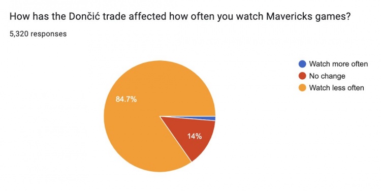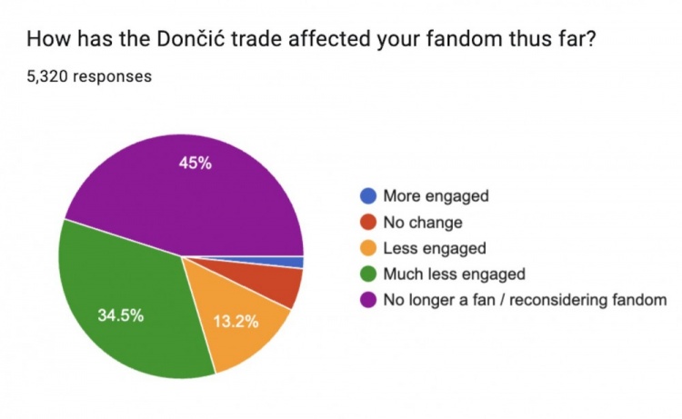 在東契奇交易如何影響你對(duì)球隊(duì)的喜愛這個(gè)問題上?45%的球迷表示不再是一名球迷或者要重新考慮自己的喜愛程度;34.5%表示自己現(xiàn)在參與度低多了,13.2%的球迷表示自己參與度略有降低,只有7.3%的球迷表示自己的喜愛度沒有變化或者參與度更高了。