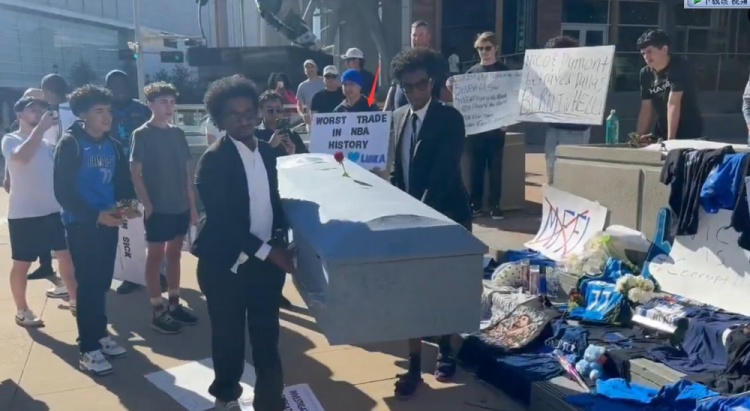 2月2日晚些時候,球迷們神情肅穆地聚集在球館外諾維茨基雕像前——現(xiàn)場甚至還有一口獨(dú)行俠配色的棺材,他們?yōu)楠?dú)行俠舉行了一場葬禮。諾維茨基雕像下方刻著的“忠誠永不消逝”幾個字,此刻顯得格外虛偽。