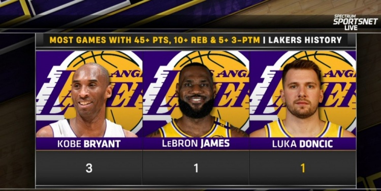 單場(chǎng)45分10板&命中5+三分!東契奇成湖人隊(duì)史科詹后第三人