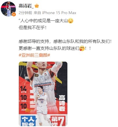 賽后,高詩巖發(fā)文寫道:“人心中的成見是一座大山,但是我不在乎!感謝邱導(dǎo)的支持,感謝山東隊和我的所有隊友們!更感謝一直支持山東隊的球迷們??!”