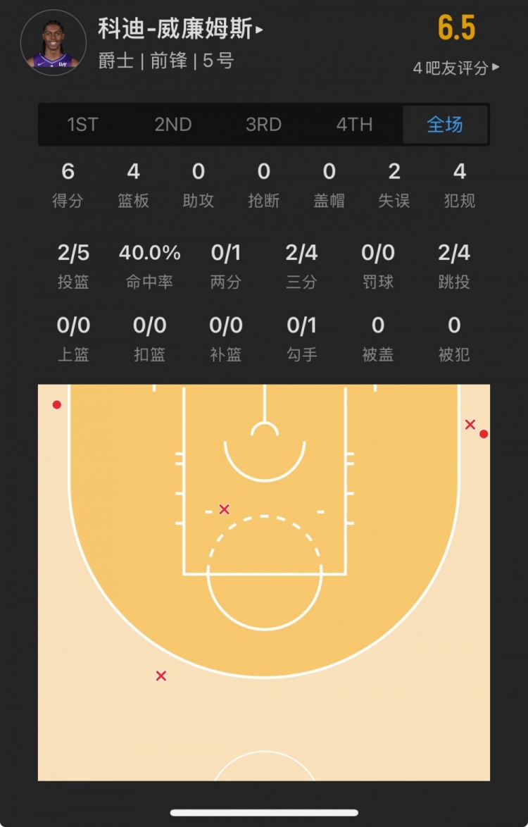 爵士10號(hào)秀 科迪-威廉姆斯 登場(chǎng)26.2分鐘