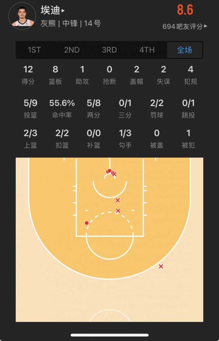 灰熊9號(hào)秀 扎克-埃迪 登場27.2分鐘