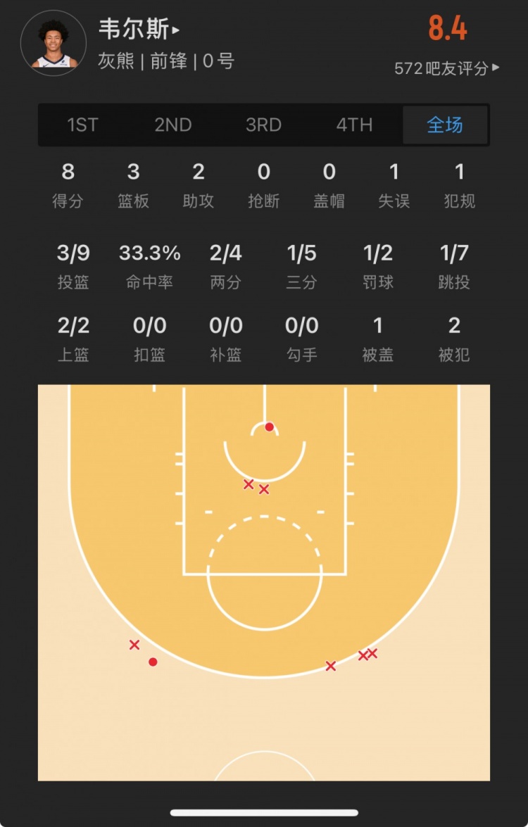 灰熊39號(hào)秀 杰倫-韋爾斯 登場26.1分鐘