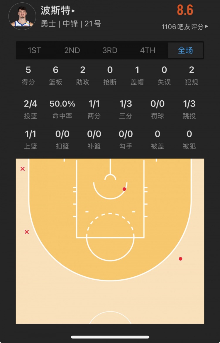 勇士52號(hào)秀 昆滕-波斯特 登場19.4分鐘