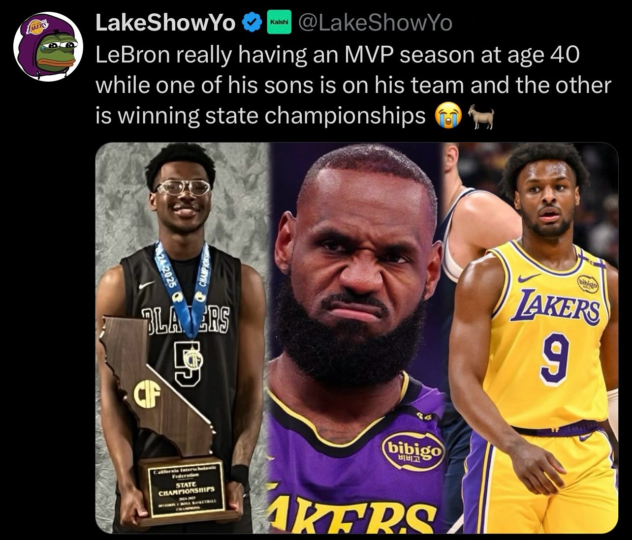 在此前進行的D1州際冠軍賽,詹姆斯二兒子布萊斯所在的塞拉峽谷高中以58-53力克林肯高中奪得州際冠軍。
