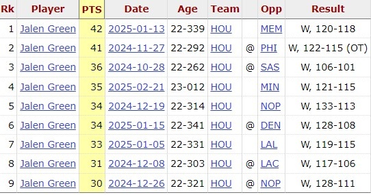 據統(tǒng)計,這是杰倫-格林本賽季第10場30+,而這10場火箭全勝!