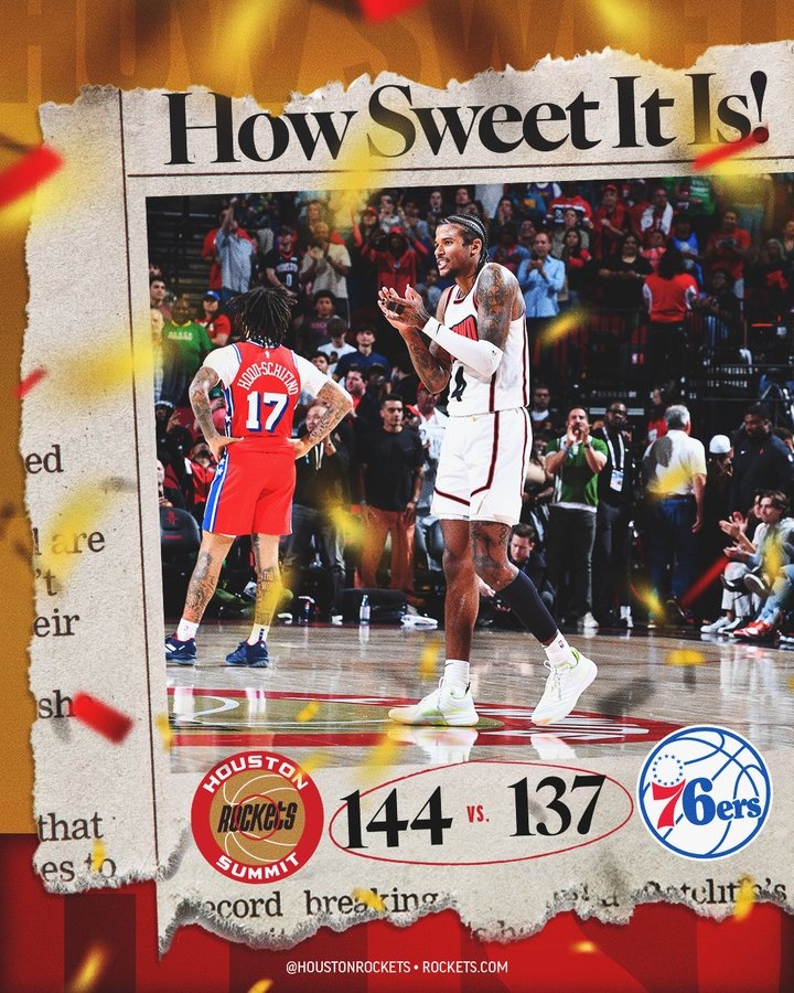 賽后,火箭官方曬出本場贏球海報,封面人物給到了助攻生涯新高的杰倫-格林,席菲諾雙手插腰成背景板。