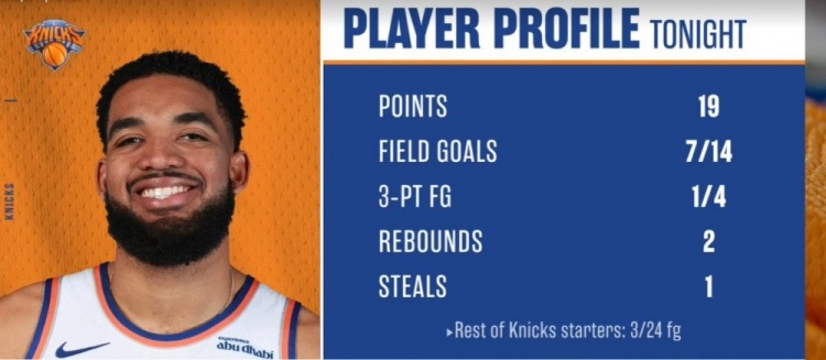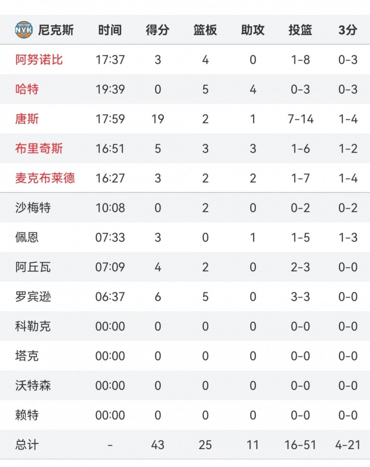 半場比賽,尼克斯首發(fā)除了唐斯以外都表現(xiàn)不佳,投籃共計(jì)24中3,共得到11分。
