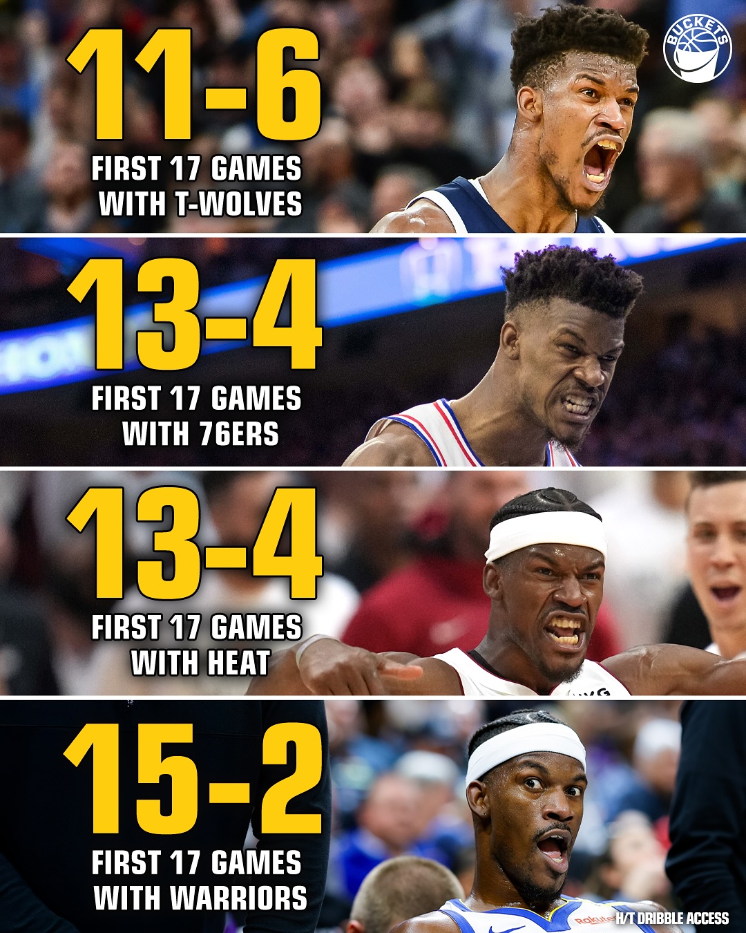 吉米效應?巴特勒生涯四次轉(zhuǎn)會后前17場比賽 勇士15-2戰(zhàn)績最好