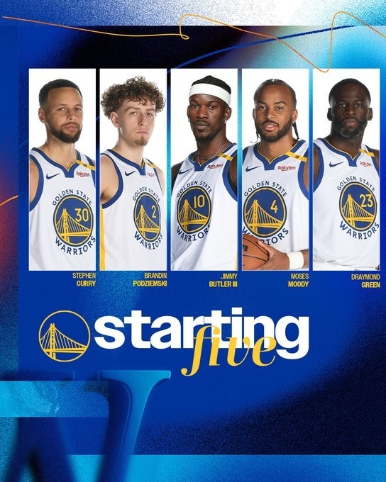 勇士官方賽前公布了本場(chǎng)比賽首發(fā)陣容:庫(kù)里、波杰姆斯基、巴特勒、穆迪、追夢(mèng)。