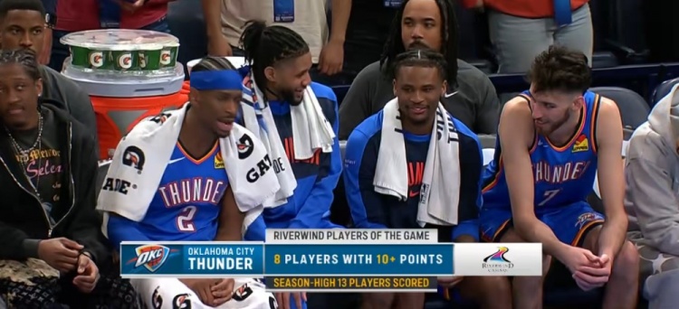 本場比賽雷霆全員發(fā)揮,全隊共有13個人有得分入賬,創(chuàng)本賽季新高,其中更是有8人得分上雙!