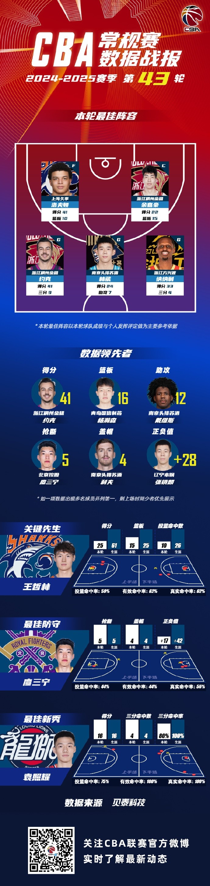 2024-2025賽季CBA聯(lián)賽常規(guī)賽第43輪結(jié)束較量,來自上海久事大鯊魚的洛夫頓,浙江稠州籃球俱樂部余嘉豪和約克,南京同曦籃球俱樂部的林葳和浙江廣廈籃球俱樂部的納納利入選CBA聯(lián)賽常規(guī)賽第43輪最佳陣容!