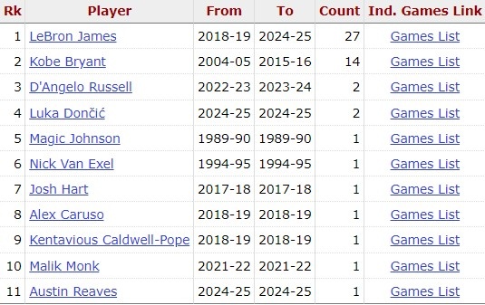 湖人隊史30+5+5+5三分場次:詹姆斯27 科比14 東契奇&拉塞爾2