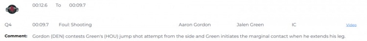 比賽最后9.7秒,戈登(掘金)從側(cè)面干擾杰倫-格林(火箭)的投籃出手,格林在伸腿時(shí)主動(dòng)制造了輕微接觸。