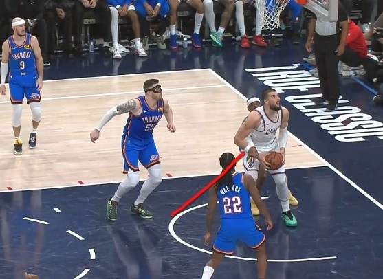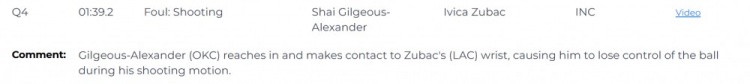比賽最后1:39,快船落后99-100落后1分,亞歷山大(雷霆)伸手接觸到祖巴茨(快船)的手腕,導(dǎo)致他在投籃動作中失去對球的控制。