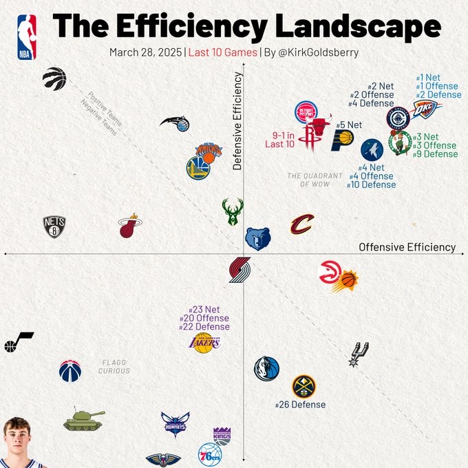 過去10場攻防:雷霆進攻第1 快船凈效率第2 湖人防守第22