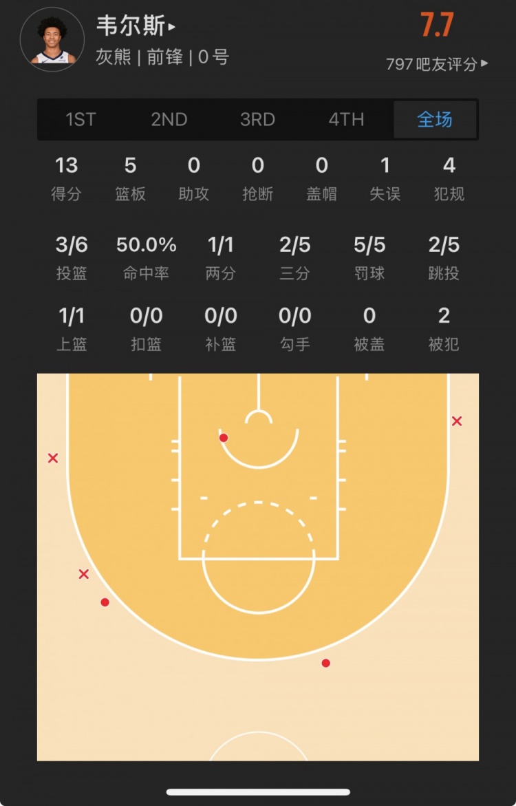 灰熊39號(hào)秀 杰倫-韋爾斯 登場28.2分鐘