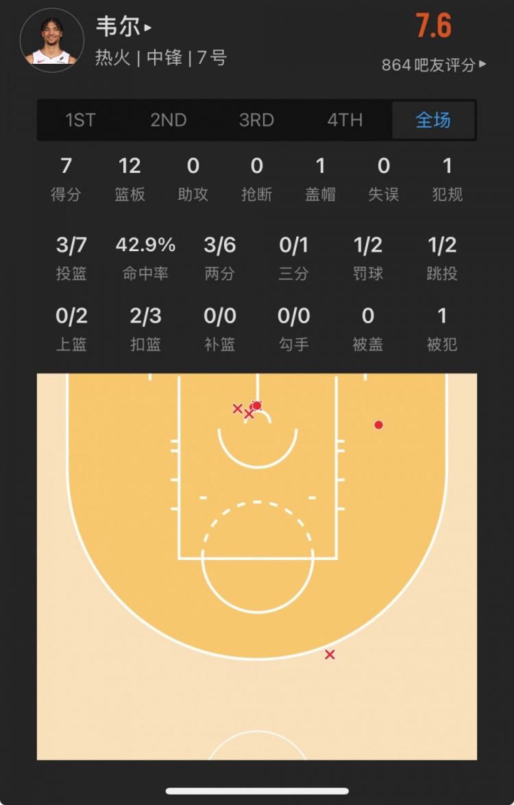 熱火15號(hào)秀 克雷爾-韋爾 登場21.4分鐘
