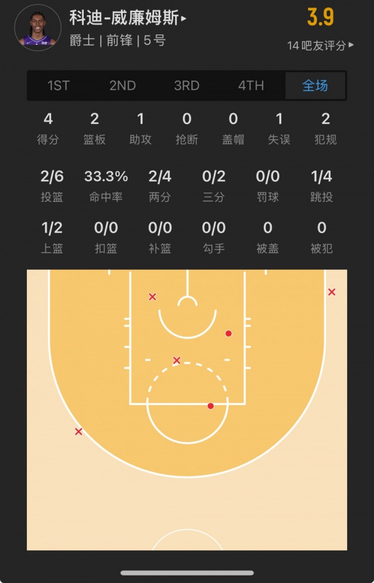 爵士10號(hào)秀 科迪-威廉姆斯 登場20.4分鐘