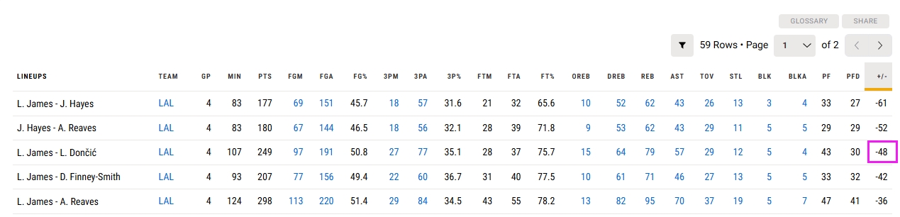 A史密斯亮出數(shù)據(jù):“詹姆斯復(fù)出之后,湖人1勝3負(fù),盧卡和詹姆斯同時(shí)在場的正負(fù)值分別是-13、-14、-12、-9,兩人在場時(shí)一共輸了48分?!?/p>