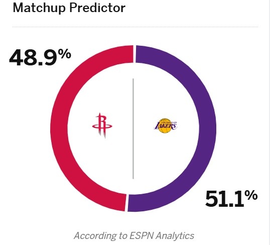 今天,ESPN預測本場比賽勝率,湖人51.1%略占優(yōu)勢,火箭(背靠背第二戰(zhàn))48.9%。