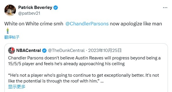 今天,貝弗利則打臉帕森斯,轉(zhuǎn)發(fā)了后者曾說(shuō)“里夫斯15+5+5就已經(jīng)到極限了”的言論,并寫道:“白人看不起白人,無(wú)語(yǔ)了,像個(gè)男人一樣出來(lái)道歉!”
