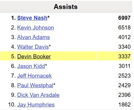 這樣一來,布克太陽(yáng)生涯助攻數(shù)達(dá)到3341,超越沃爾特-戴維斯升至隊(duì)史第4。