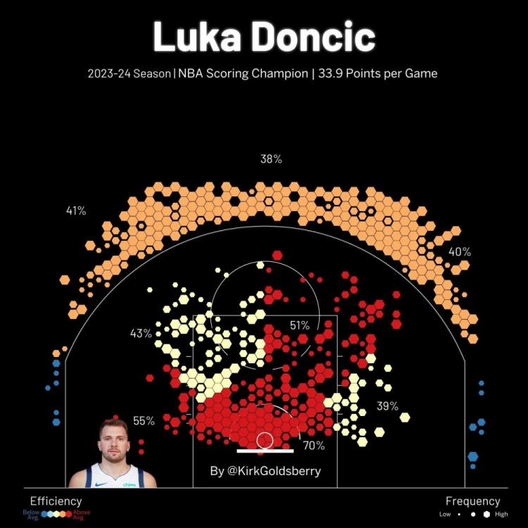 有了東契奇,湖人隊(duì)就擁有了籃球界最好的年輕得分手,同時(shí)也是本世紀(jì)20年代得分能力的典范。在此前7個(gè)賽季中,這位25歲的斯洛文尼亞人場均得分(28.6分)在NBA歷史上排名第三,僅次于邁克爾-喬丹和威爾特-張伯倫。憑借已經(jīng)獲得的5次NBA最佳陣容一陣的榮譽(yù),東契奇是有史以來成就最高的年輕球員之一。上賽季,東契奇以場均33.9分的表現(xiàn)贏得了得分王的頭銜,當(dāng)時(shí)他年僅24歲。東契奇的投籃分布圖證明他完全是一位現(xiàn)代籃球的球員,他在三分線外和禁區(qū)內(nèi)都表現(xiàn)出色。