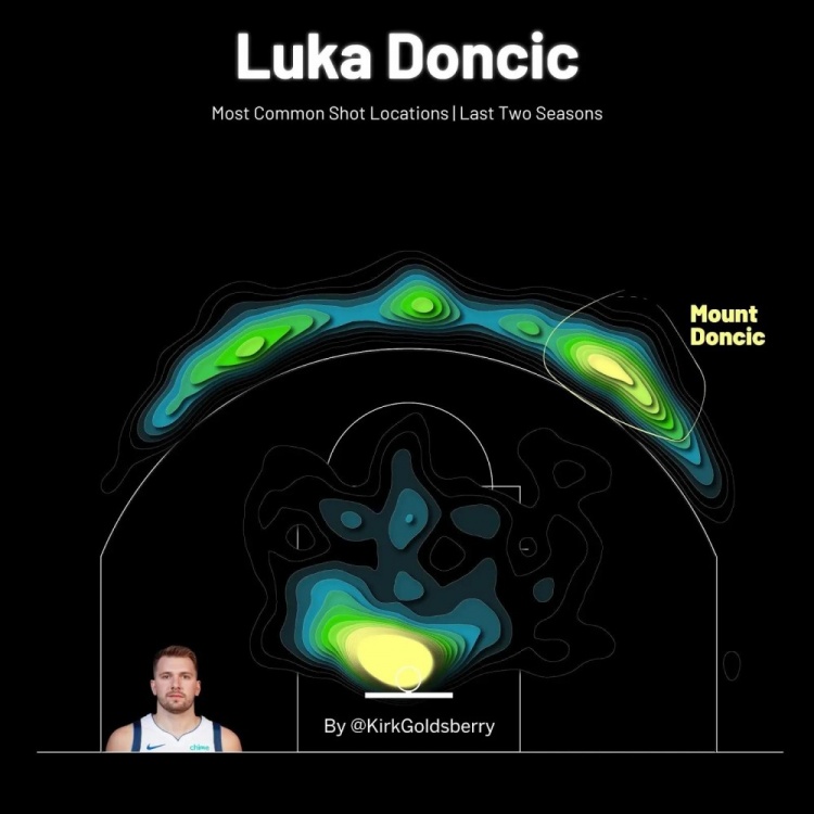 當(dāng)你繪制出東契奇最常見的投籃位置時(shí),有兩個(gè)熱點(diǎn):一個(gè)在籃筐附近,另一個(gè)是在三分線外左側(cè)45度處。這個(gè)外線熱點(diǎn)正是東契奇在周日的比賽中讓布勞恩上當(dāng)?shù)牡胤健@也是東契奇最喜歡的起舞的位置。
