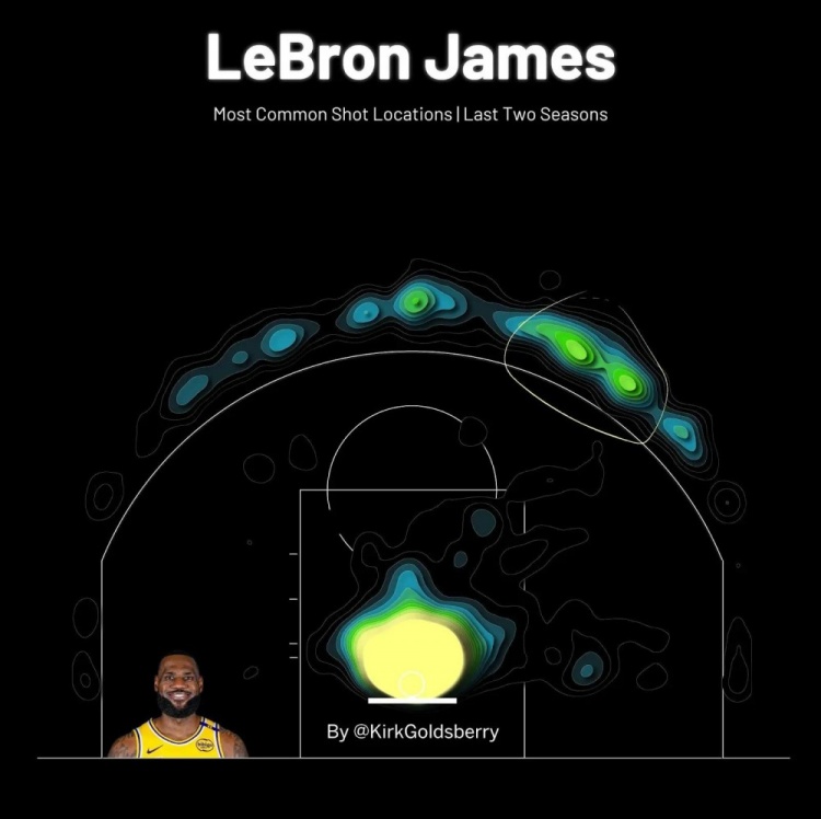 這與卡爾-馬龍和約翰-斯托克頓的情況不同。詹姆斯和東契奇都喜歡球場上的相同位置,兩人都偏愛三分線外左側(cè)45度以及突破至籃下。