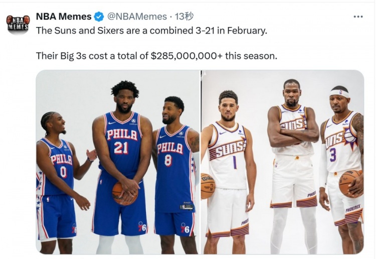 美媒NBA Memes:“太陽和76人二月份共計3勝21負,而他們的三巨頭本賽季工資共計超過2.85億美元?!?/p>