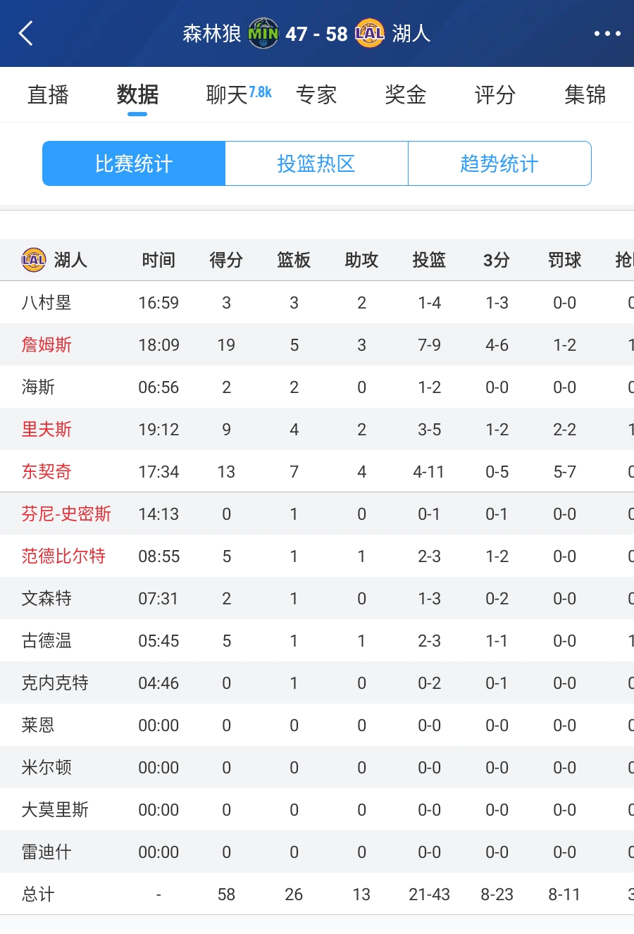 詹姆斯9中7高效19分5板3助 東契奇已筑三雙雛形 湖人半場(chǎng)領(lǐng)先11分
