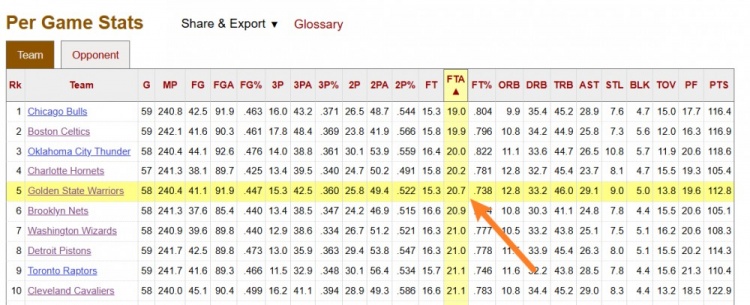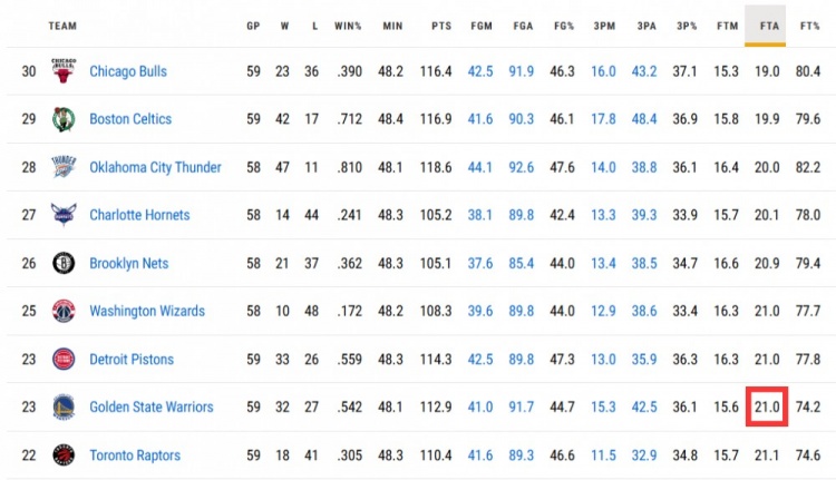 本場(chǎng)比賽之前,勇士本賽季場(chǎng)均20.7次罰球,聯(lián)盟第5少。