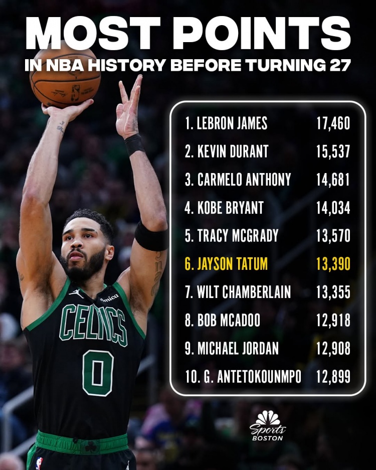 塔圖姆(26歲363天)在27歲前的總得分來到13390,超越張伯倫,暫列歷史第六。