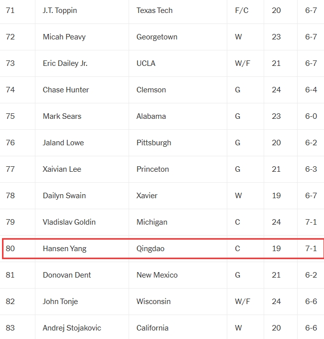 03月01日訊 美媒TA更新了最新一期的2025年選秀大板。中國(guó)球員楊瀚森排在第80位。