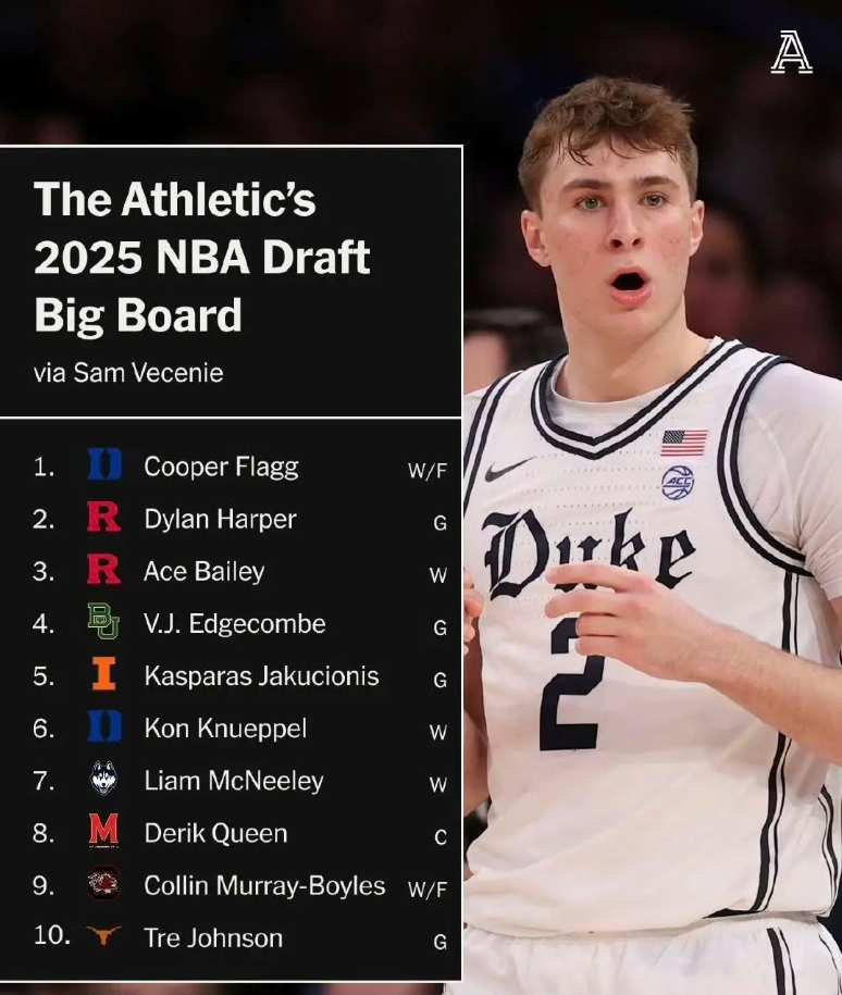 根據(jù)最新的榜單,杜克新星庫(kù)珀-弗拉格依舊占據(jù)榜首,來(lái)自羅格斯大學(xué)的雙子星迪倫-哈珀和埃斯-貝利分列二三。