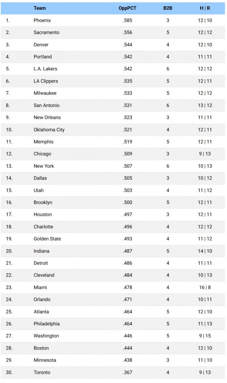 以下是各隊剩余賽程的強度排名,按對手累計勝率從高到低排序: