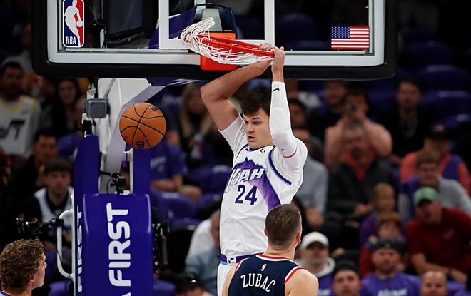 本場比賽中,爵士的先發(fā)中鋒沃克-凱斯勒(Walker Kessler)的表現(xiàn)算得上是令人刮目相看。凱斯勒全場出場28分40秒,投籃7中7,三分線外2中2,罰球8中6,以運動戰(zhàn)100%的命中率得到了全場最高分22分外加9籃板4助攻2搶斷4蓋帽的全面數(shù)據(jù),還有1次失誤和5次犯規(guī),正負值為+13。凱斯勒在進攻端展現(xiàn)出了全面的得分能力,他不僅有著出色的籃下得分能力和進攻效率,他在外線投籃方面的穩(wěn)定性也令人眼前一亮,而且他還展現(xiàn)出了一定的傳球能力和策應能力。除此之外,凱斯勒在防守端也是有著超強的護框能力和內線防守能力,他在籃板保護方面也同樣能夠起到關鍵的效果。凱斯勒在本場比賽中的表現(xiàn)遠遠不只是一名普普通通的藍領型中鋒,他簡直是打出了頂級藍領型中鋒的水準。