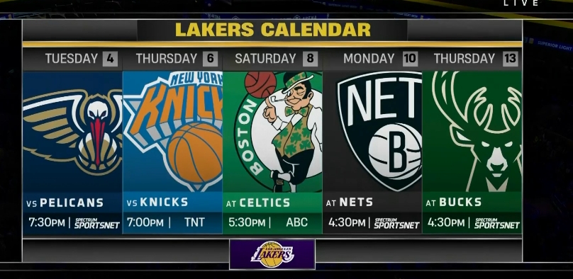 2主3客!湖人未來(lái)5場(chǎng)對(duì)手:鵜鶘/尼克斯/凱爾特人/籃網(wǎng)/雄鹿