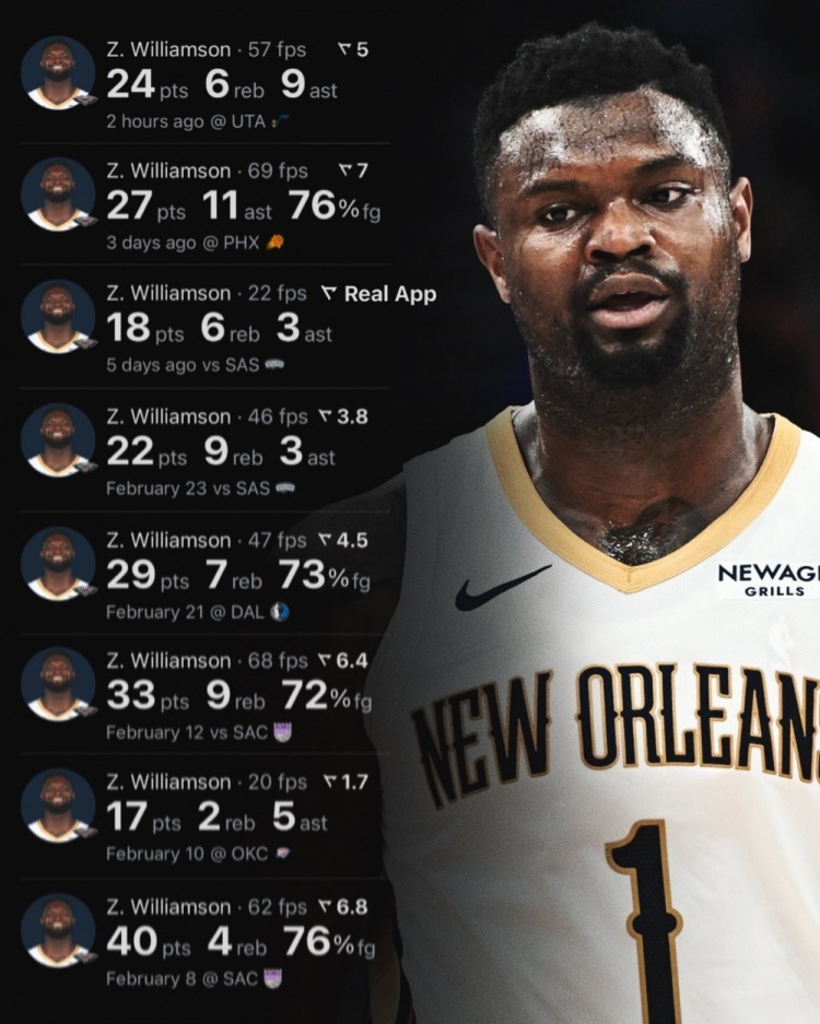 據(jù)統(tǒng)計,在近10場比賽中,錫安在場均28.3分鐘的上場時間里,可以砍下26.3分6.6籃板5.6助攻,投籃命中率高達(dá)65.2%,