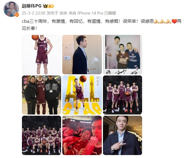 趙繼偉曬照并寫道:“cba三十周年,有激情,有回憶,有溫情,有感慨!很榮幸!很感恩????????再見長(zhǎng)春! ???”