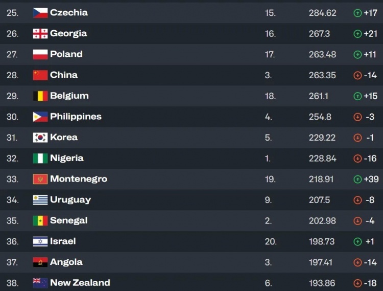 接著,你還要看看對(duì)手的世界排名,據(jù)此加上第三個(gè)項(xiàng),公式為1.5*(世界排名平均數(shù)-對(duì)手排名),這蘊(yùn)含著擊敗越強(qiáng)對(duì)手獲益越多、輸給越弱對(duì)手懲罰越重的理念。2023年?duì)顟B(tài)強(qiáng)勁的拉脫維亞,曾短期內(nèi)連續(xù)掀翻西班牙、法國(guó)、希臘在內(nèi)的多支排名高于自己的強(qiáng)隊(duì),世界杯正賽上更是大勝巴西立陶宛喜提第五,藉此排名從29名暴漲到前八。