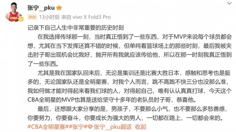 全明星正賽南北區(qū)對決時,北區(qū)明星隊最終以159比136戰(zhàn)勝南區(qū)明星隊,北區(qū)中鋒鄒雨宸砍下23分,獲得全明星賽MVP。值得一提的是,張寧在比賽末節(jié)時刻面對夾擊,并沒有選擇“單打刷分”,而是傳球給了鄒雨宸,助力鄒雨宸完成暴扣,進而拿下MVP。