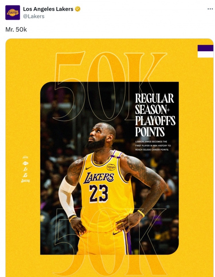詹姆斯生涯50000分!湖人官方曬照:五萬(wàn)分先生