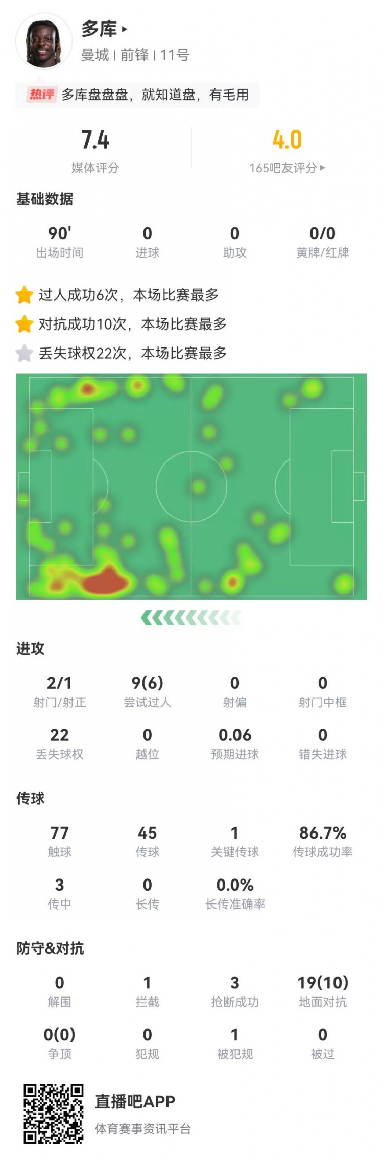 3月8日訊 曼城在本輪英超0-1不敵諾丁漢森林,多庫本場數(shù)據(jù)如下: