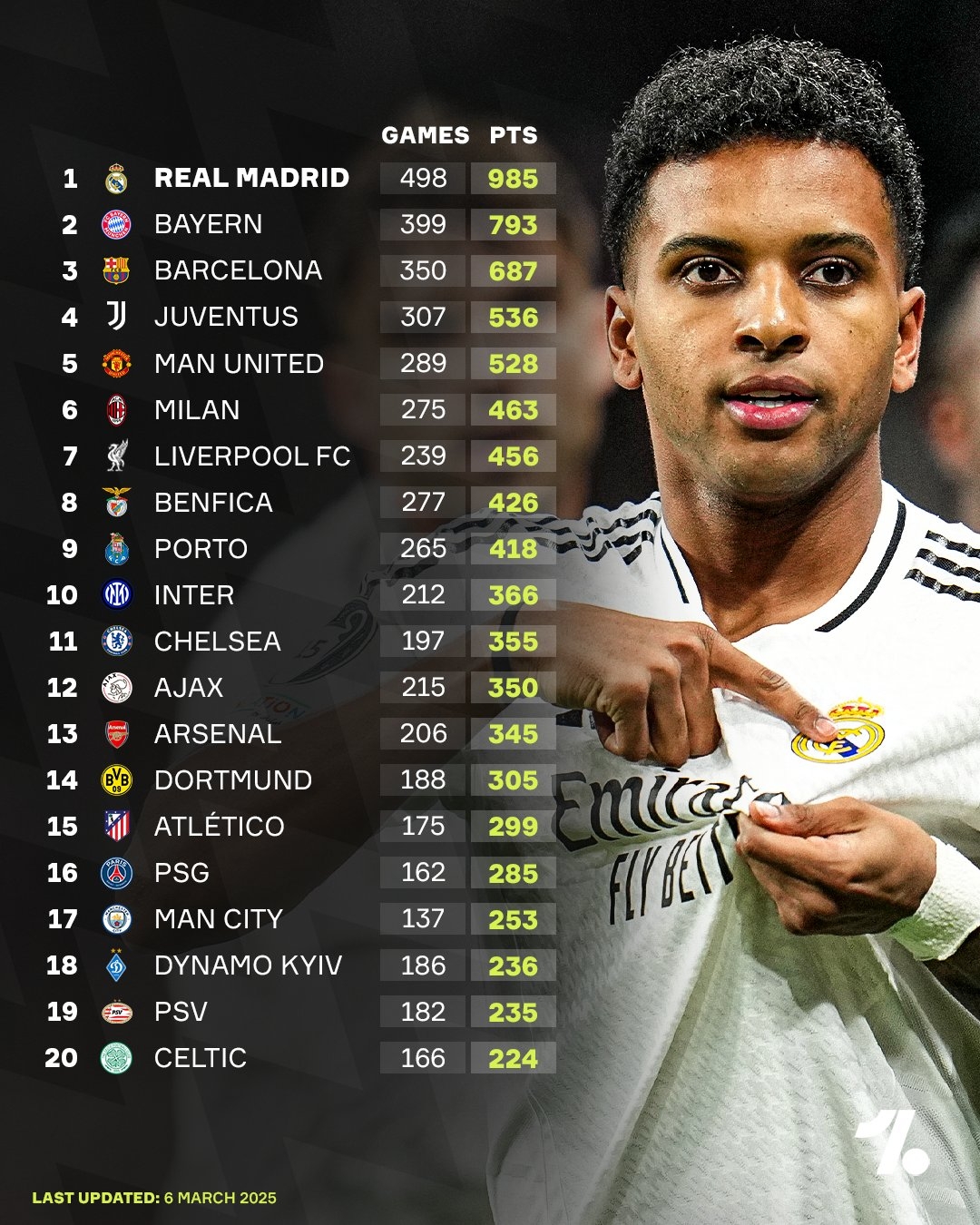 03月08日訊 在OneFootball公布的歐冠歷史積分榜上,皇馬以498場(chǎng)比賽積985分的成績(jī)高居榜首,拜仁399場(chǎng)積793分排在第二位,巴薩350場(chǎng)比賽687分位列第三。